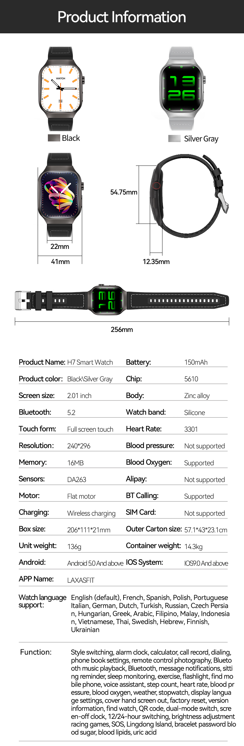 Introducing the Smart Watch H7, a cutting-edge wearable that redefines style and functionality. With an intelligent upgrade and undetectable wear design, it blends seamlessly into your daily routine. The 2.01" HD curved screen delivers sharp visuals, while wireless charging ensures effortless power-ups. Enjoy hands-free communication with Bluetooth calling, and track your fitness goals with multiple sports modes. Perfect for tech-savvy individuals who demand both style and performance in a smartwatch.