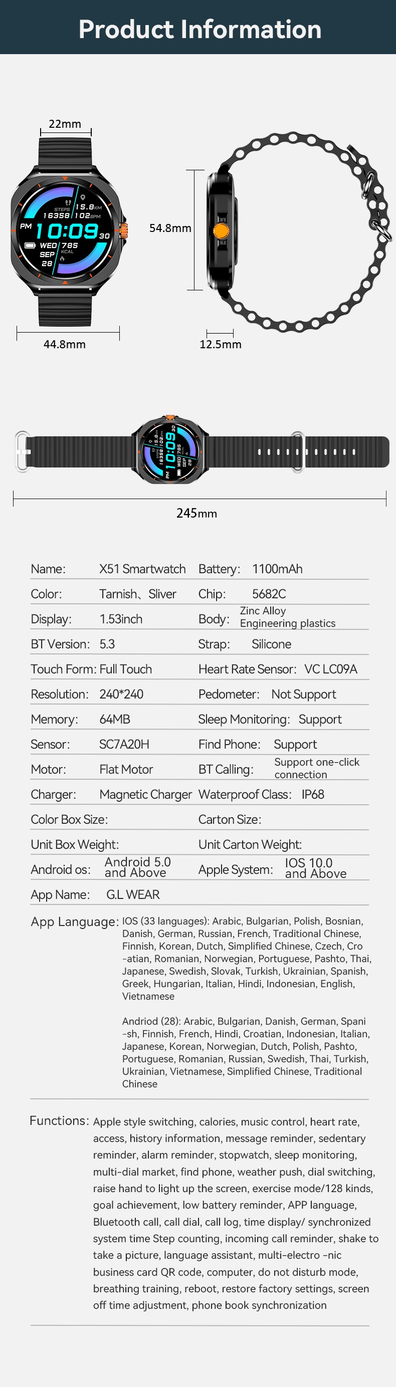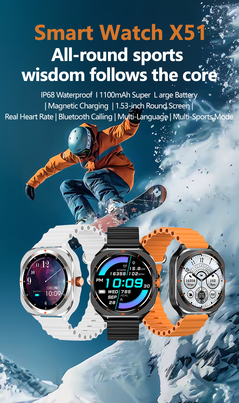 Introducing the X51 Smart Watch, the ultimate companion for all - round sports enthusiasts! Equipped with IP68 waterproofing, a 1100mAh super - large battery, magnetic charging, and a 1.53 - inch round screen, this smartwatch delivers seamless functionality. It tracks real - time heart rate, supports Bluetooth calling, and offers multi - language compatibility. With dedicated multi - sports modes, it's designed to meet your every fitness and lifestyle need. Whether you're skiing, running, or exploring, the X51 ensures you stay connected and motivated.
