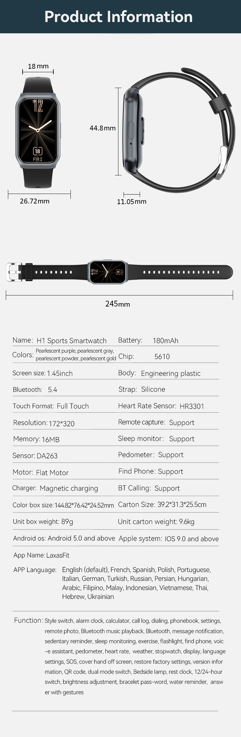 Introducing the H1 Sports Smartwatch — a versatile wearable packed with features for active lifestyles! Equipped with a 1.45" full touch screen for intuitive operation, it supports Bluetooth 5.4 connectivity, a heart rate monitor for fitness tracking, and waterproof design for all-weather use. Powered by a 180mAh battery for long-lasting wear, The LaxasFit app supports multiple languages (English, French, Spanish, Polish, Portuguese, Italian, German, Turkish, Russian, Persian, Hungarian, Arabic, Filipino, Malay, Indonesian, Vietnamese, Thai, Hebrew, Ukrainian), ensuring global usability.