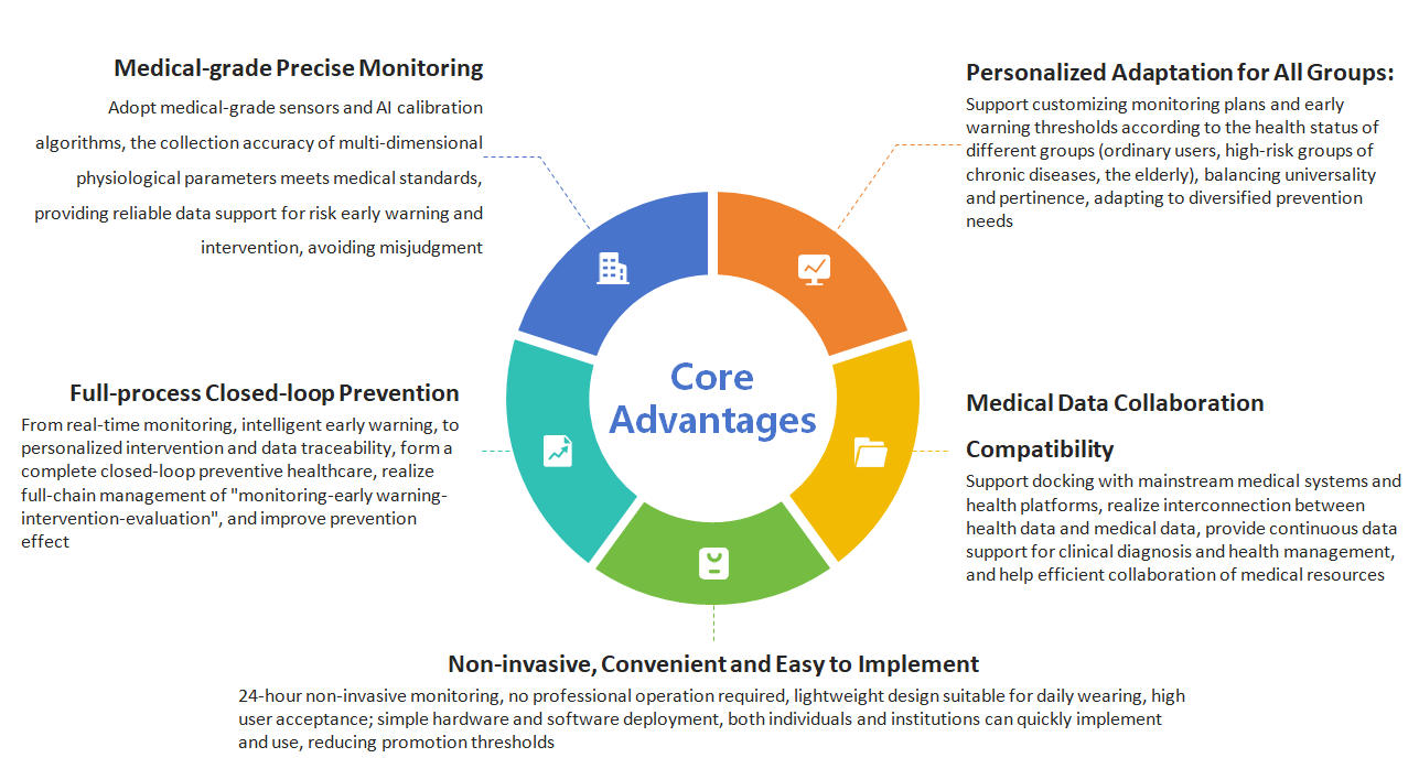 Our solution addresses the needs of all user groups—from everyday consumers to high-risk chronic patients and hospitals. Built on high-precision smartwatches, we integrate five core functions to create a complete preventive lifecycle: